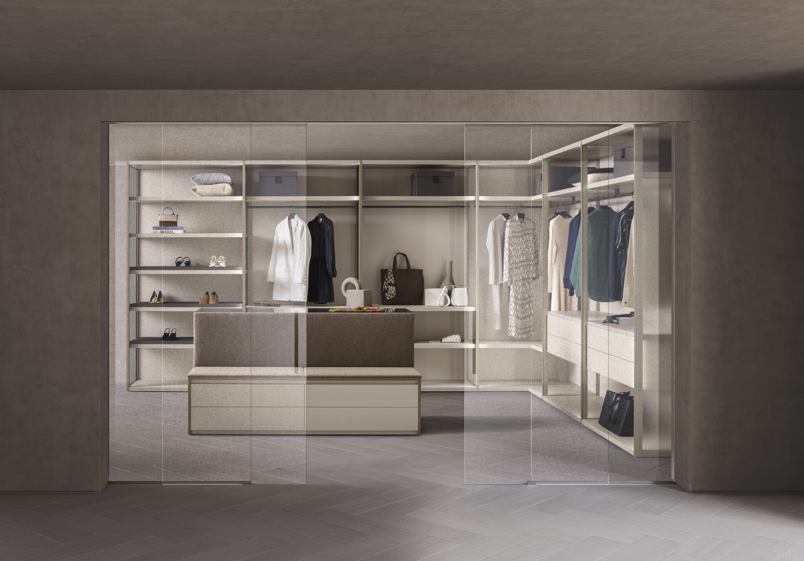 The Sipario Collection – a modern, fully-customizable walk-in closet designed for elevated spaces.