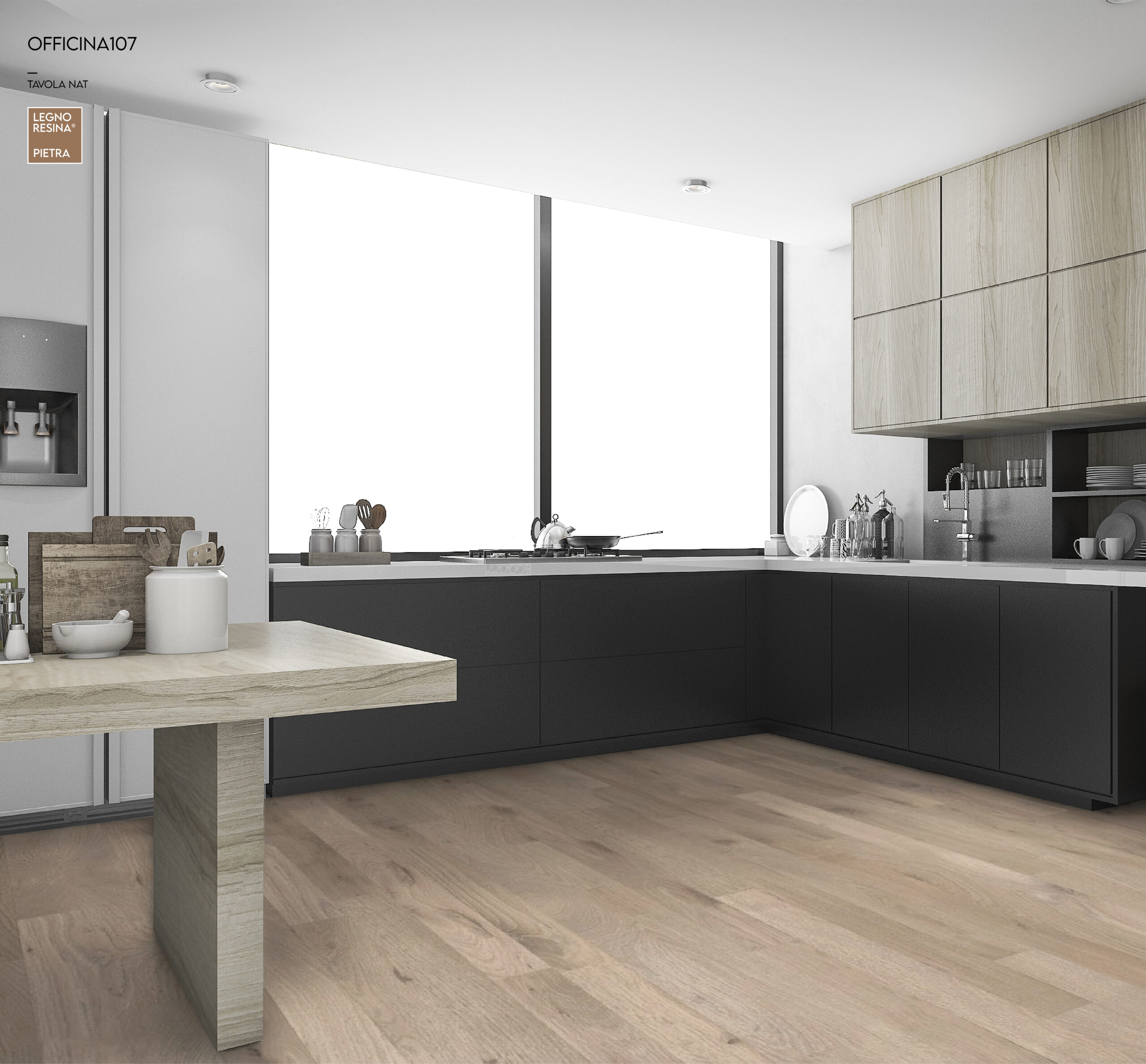 Is Officina107 suitable for high-traffic areas? Yes. All three directions within the collection are protected by Legnoresina® Pietra technology, which delivers up to 6x greater wear resistance than standard hardwood finishes. It holds up well in open-concept living spaces, modern kitchens, and other high-use areas without requiring the careful maintenance that traditional hardwood demands.