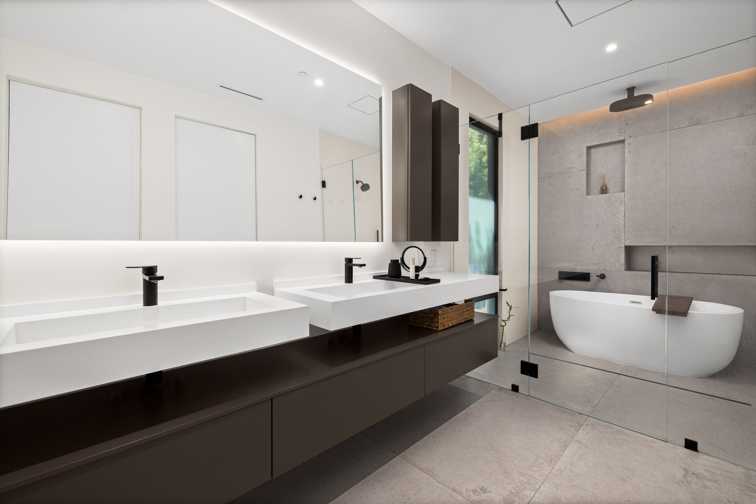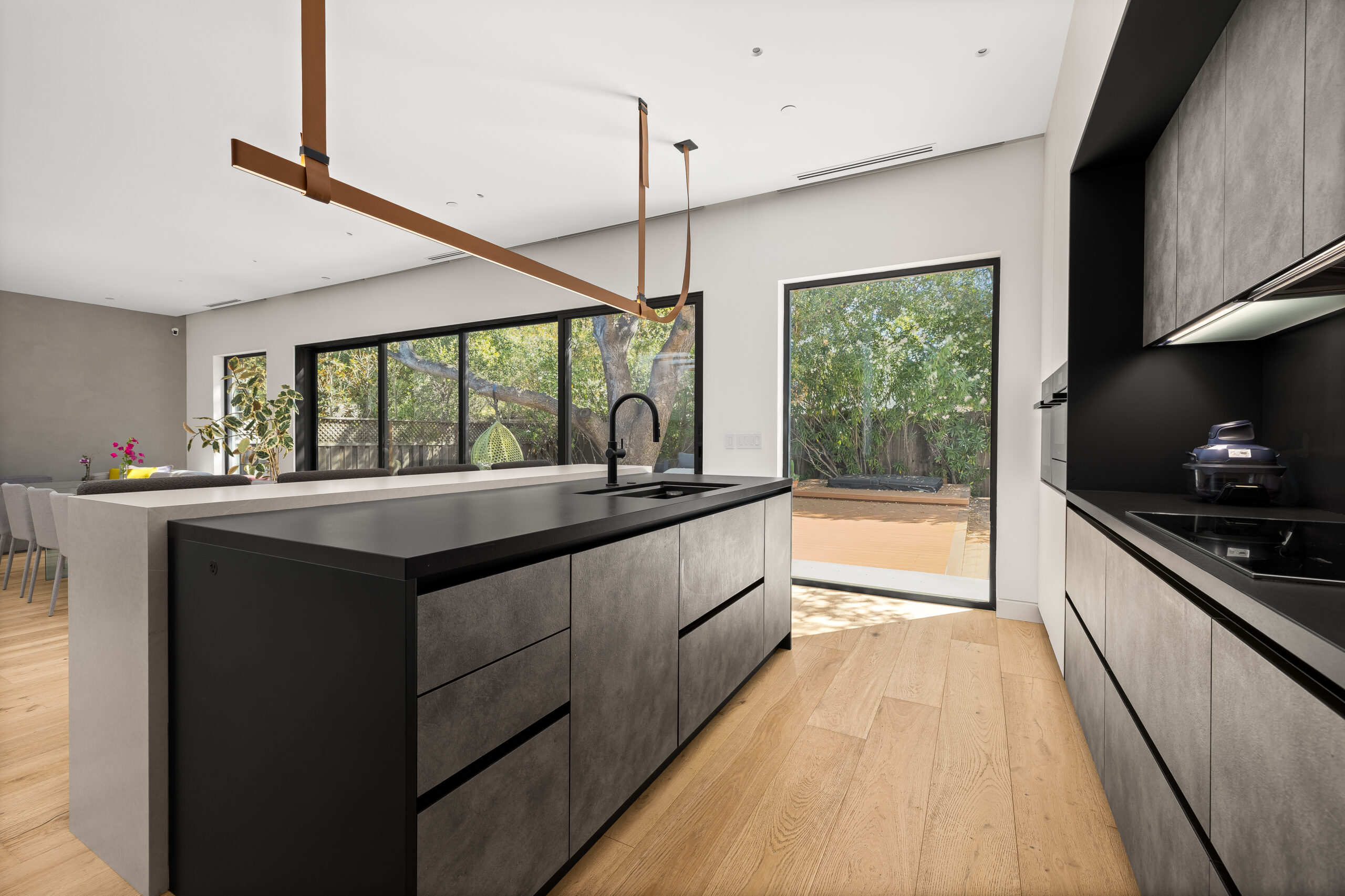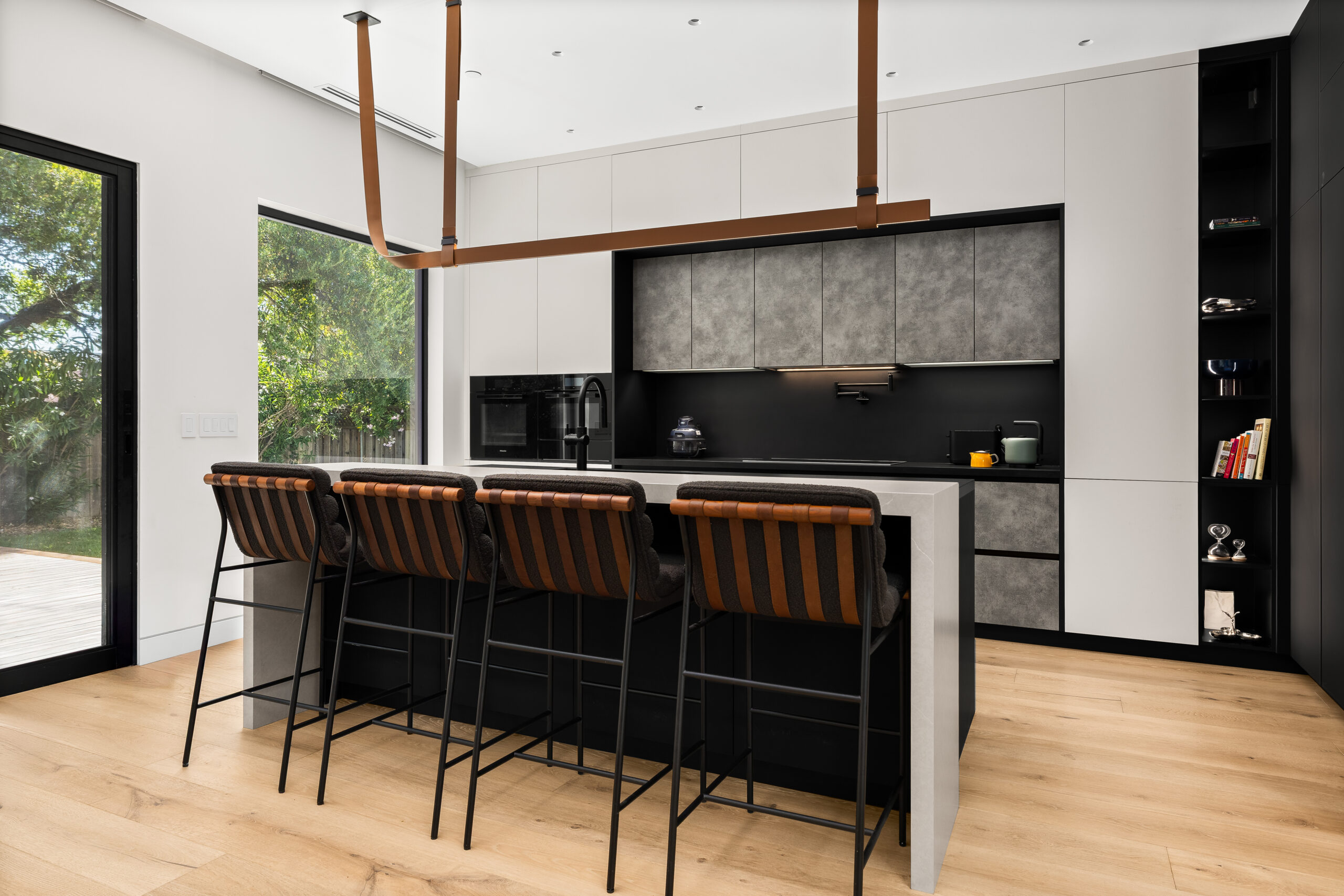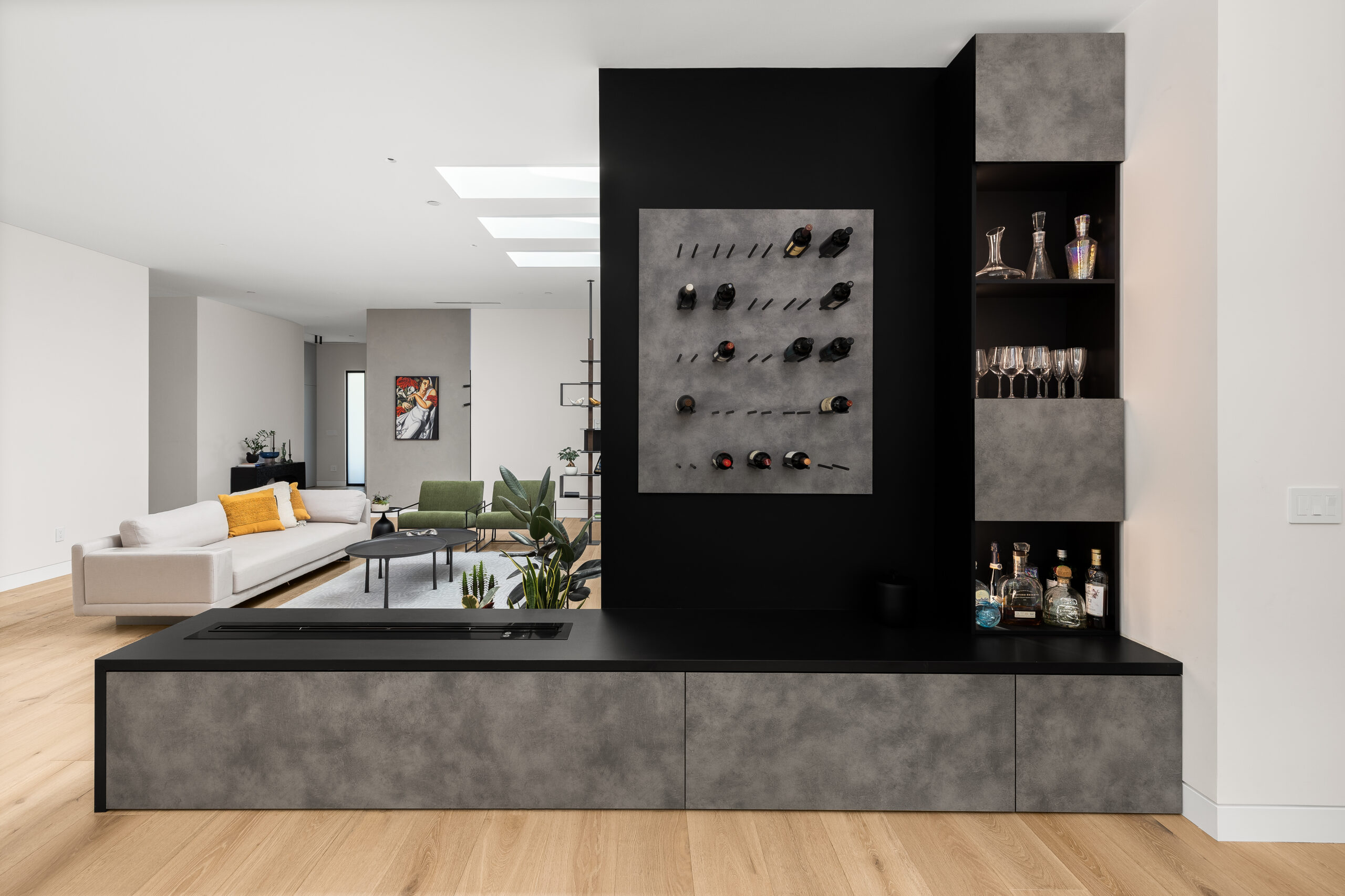 We designed and supplied the kitchen, powder room, master bathroom, and fireplace/bar for this modern Los Gatos home. The kitchen features ultra-modern cabinetry from the Bijou Collection in grey, paired with white and black cabinets from the Erika Collection. The powder room showcases the BMT Blues 4.0 Collection, while the master bathroom is complete with the sleek BMT Swing 4.0 Collection. A distinctive fireplace doubles as a bar, adding both function and style to the living space.