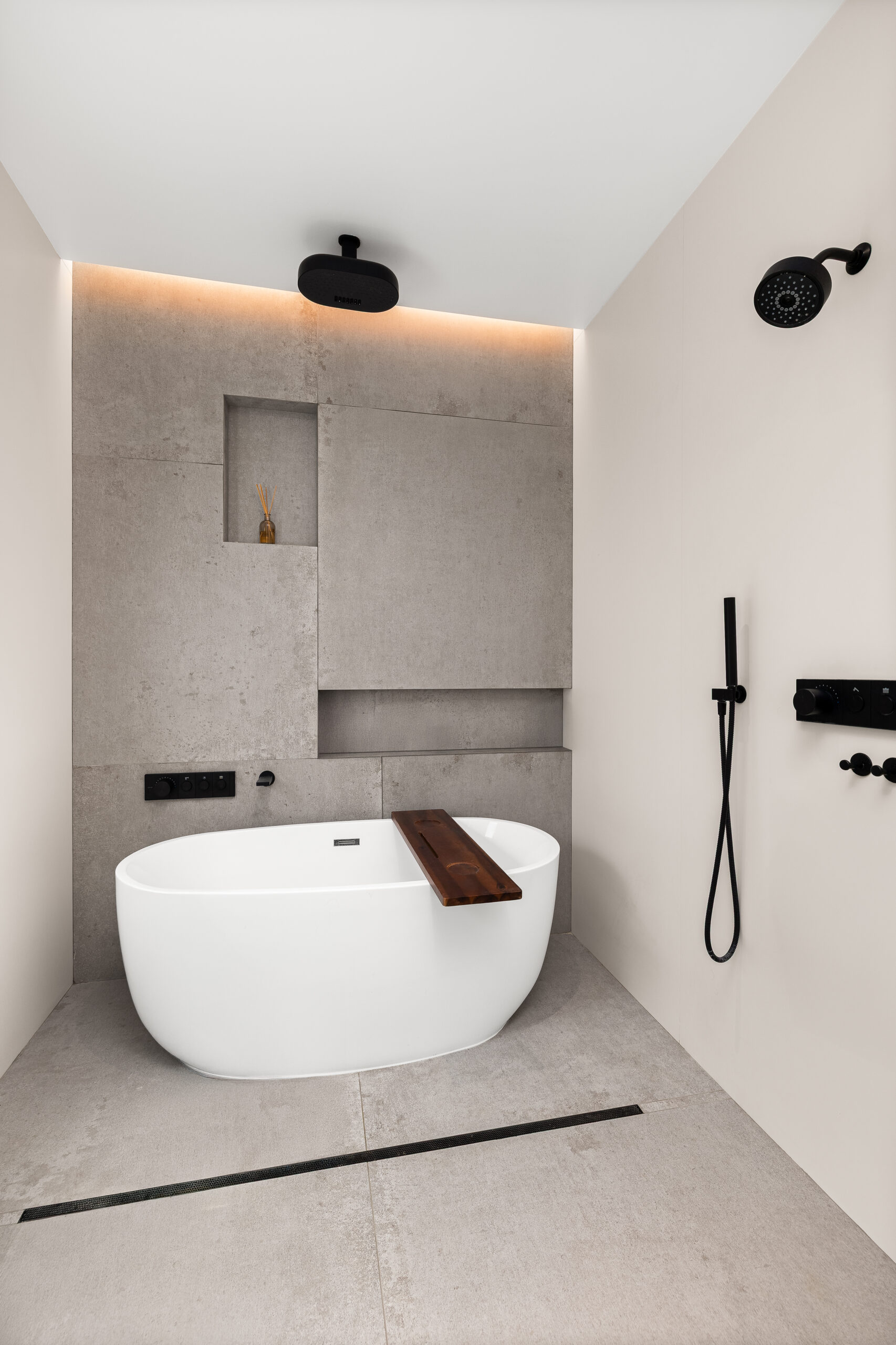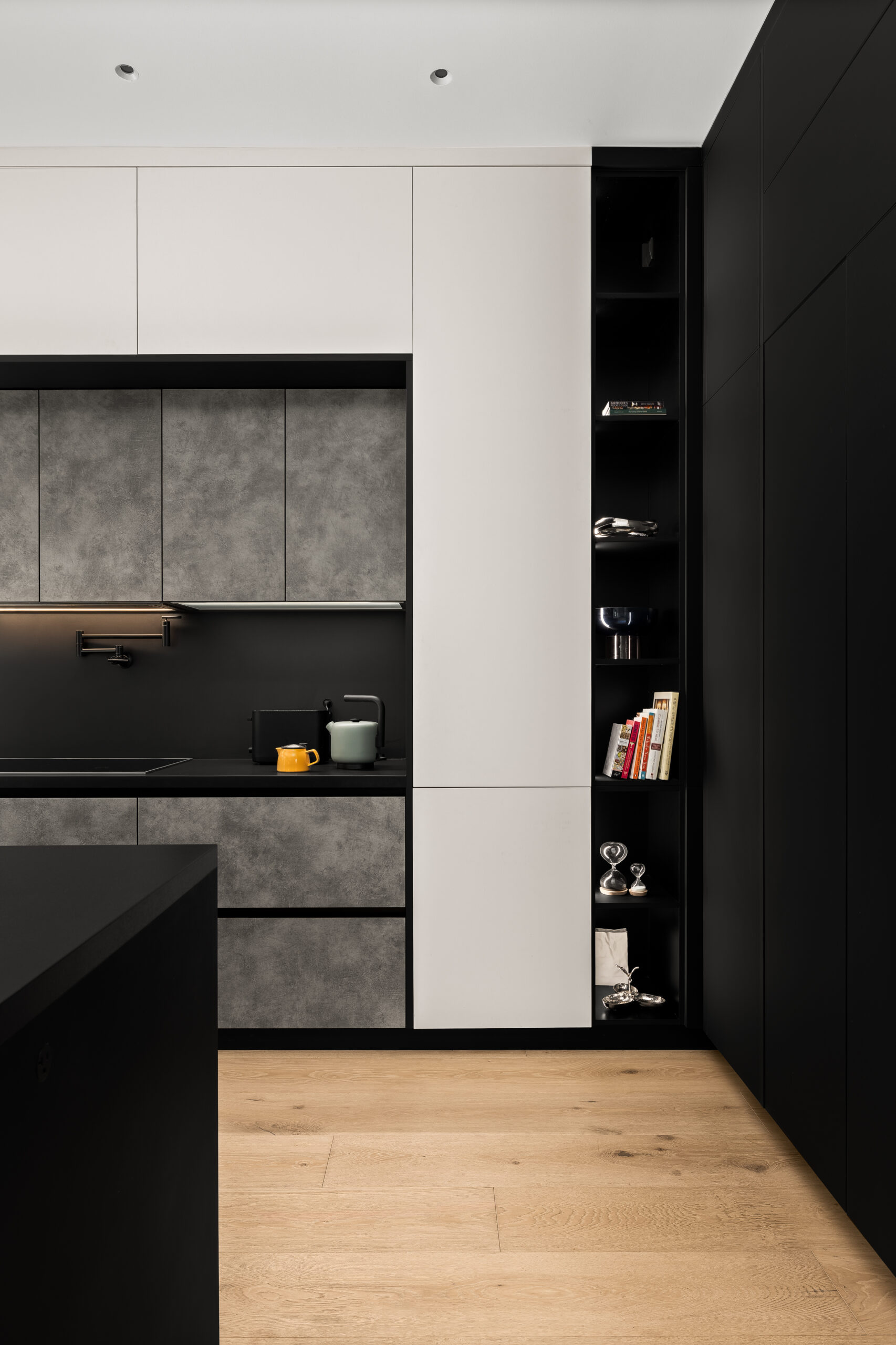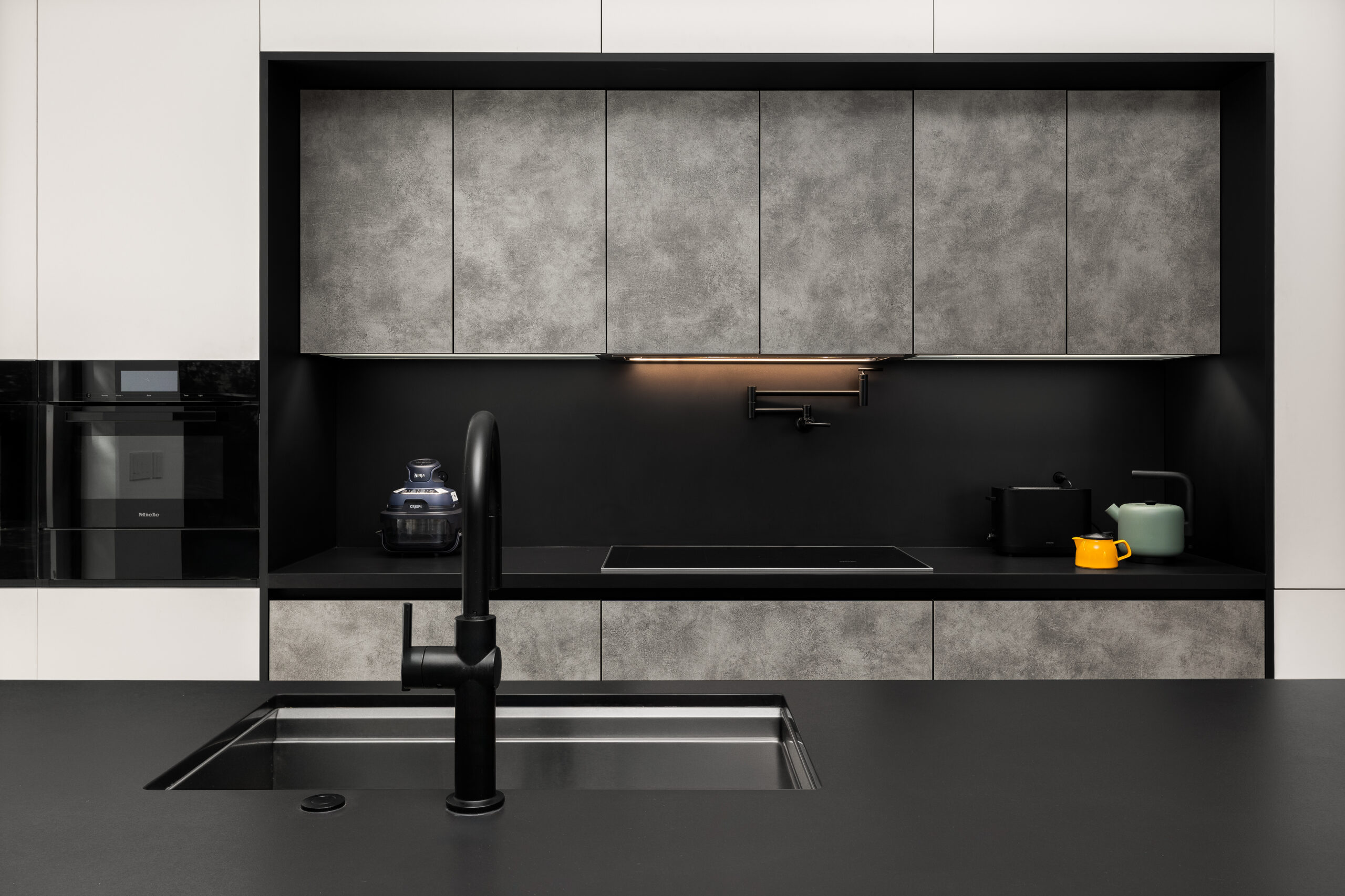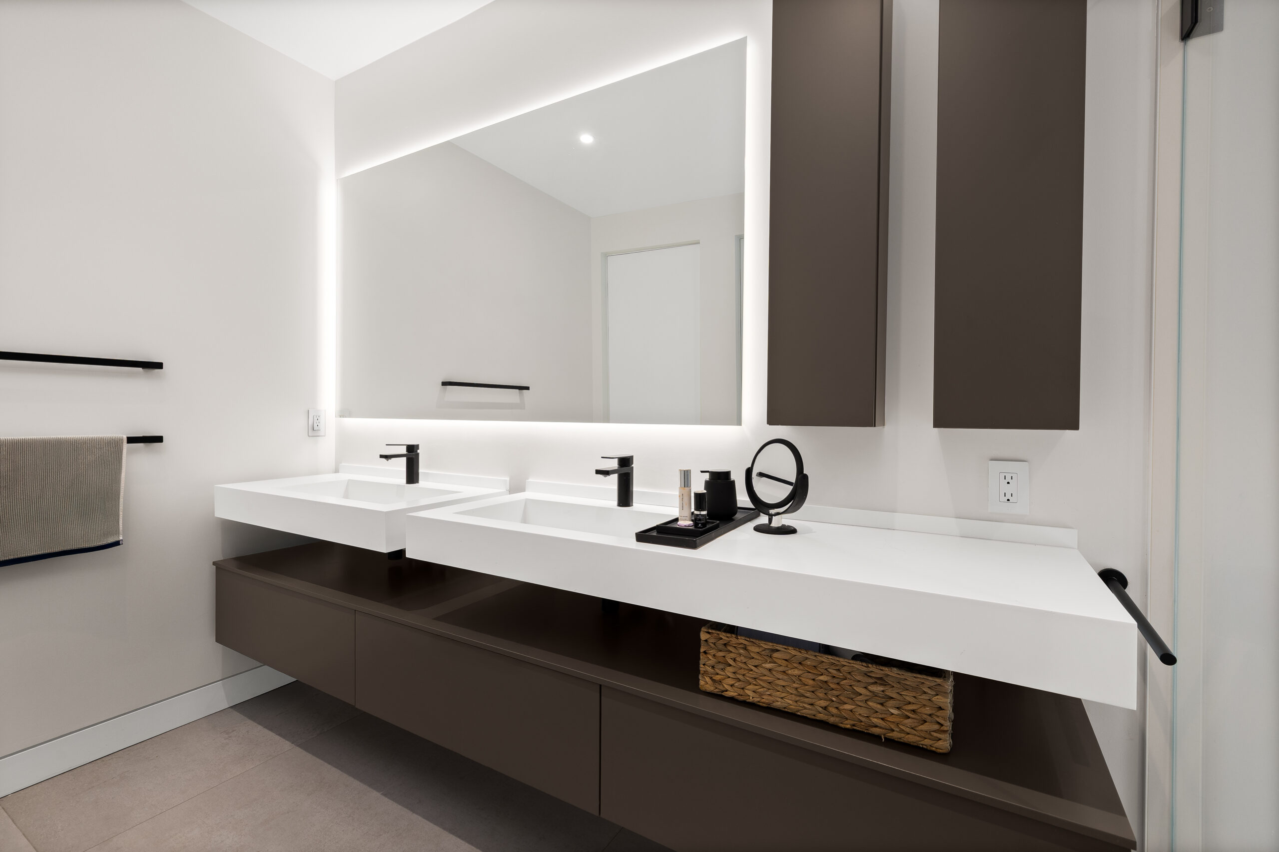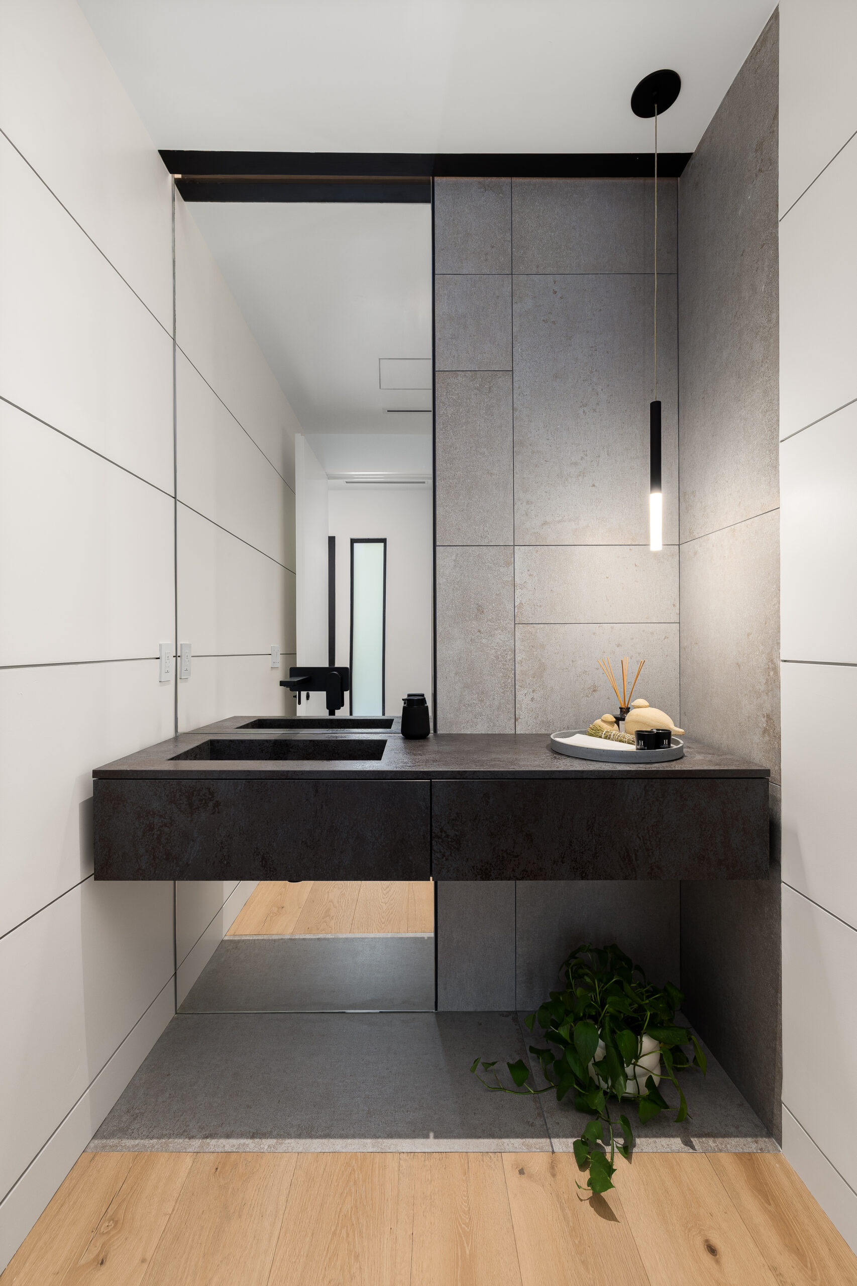 We designed and supplied the kitchen, powder room, master bathroom, and fireplace/bar for this modern Los Gatos home. The kitchen features ultra-modern cabinetry from the Bijou Collection in grey, paired with white and black cabinets from the Erika Collection. The powder room showcases the BMT Blues 4.0 Collection, while the master bathroom is complete with the sleek BMT Swing 4.0 Collection. A distinctive fireplace doubles as a bar, adding both function and style to the living space.