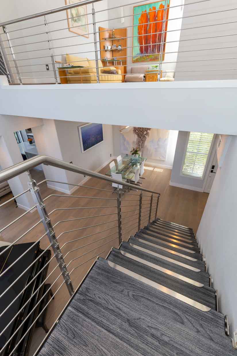 This beautiful modern kitchen, staircase, and interior doors are part of a major remodeling project in a townhouse in Redwood City, in collaboration with B.I. Modern Construction. The goal of the project was to open up and brighten up the space, creating a stylish, serene home for relaxing and entertaining alike. Wall cabinets with integrated LED undercabinet lighting from the Aran Cucine Erika collection in white matte with c-channel handle. Base cabinets from the Faro collection in Concrete with c-channel handle. Tall cabinets from the Terra collection in larch Rovere Fumo TB with variant handle. Toekick in PVC aluminum. Countertop and built-in breakfast table in Silestone quartz in Iconic White. Sink by Blanco. Appliances by Miele. Staircase by CAST with stainless steel riser, handrail, and balustrade, and wooden steps. Wood and translucent glass interior doors by Pail.