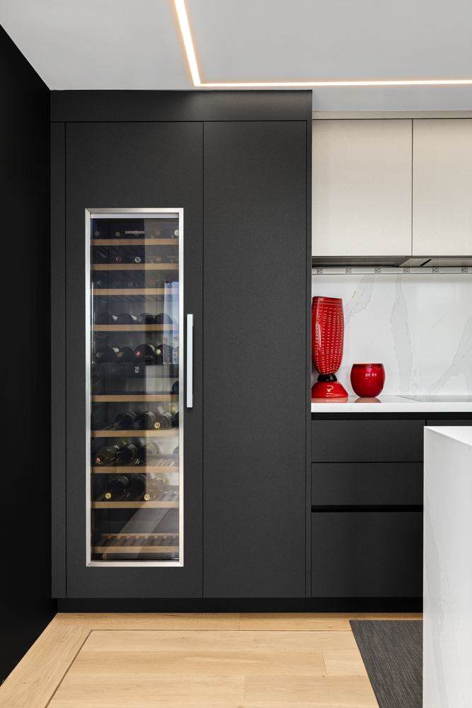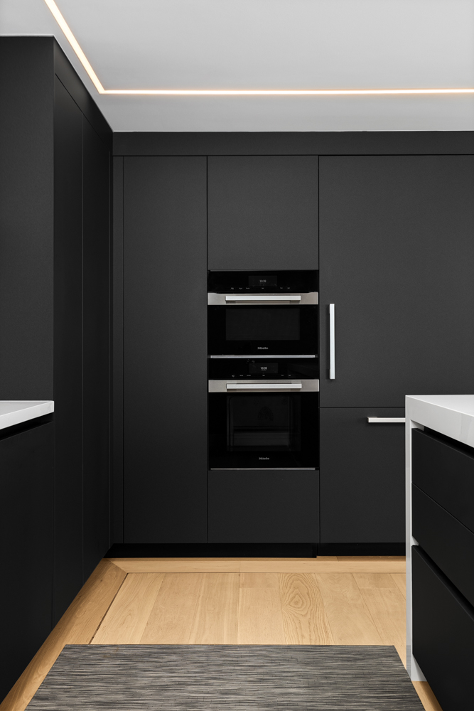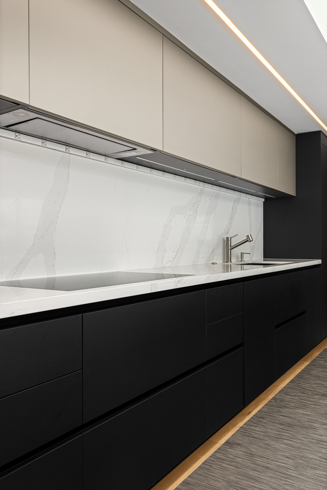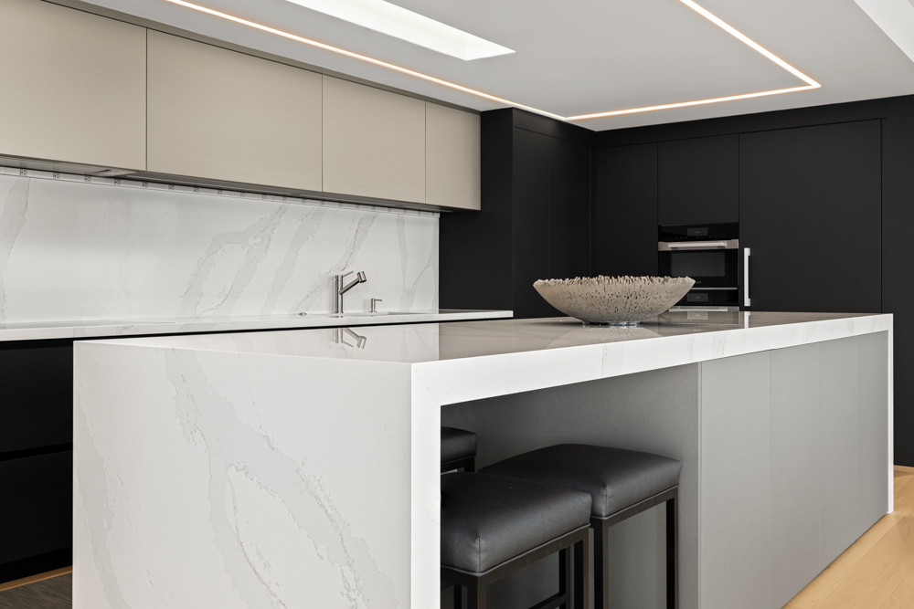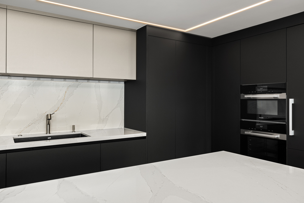 We designed and supplied this modern kitchen featuring ARAN Cucine’s Erika Collection in a bold black-and-white combination. The uniform cabinetry with integrated appliances creates a sleek, seamless look, while the statement island is complete with a waterfall countertop, serving as the centerpiece of the space.